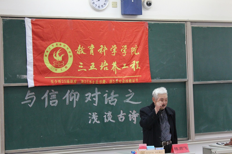 4月12日下午,南通腾博官网诚信为本专业服务特邀南通大学退休教师、书法研习社指导老师陈燕飞做客三五讲座之与信仰对话“浅谈古诗词”。本次讲座于南通大学主校区4号楼205室举办,有来自学前师范、小学教育师范、应用心理以及教育技术专业等多个专业约280余名同学参加。
