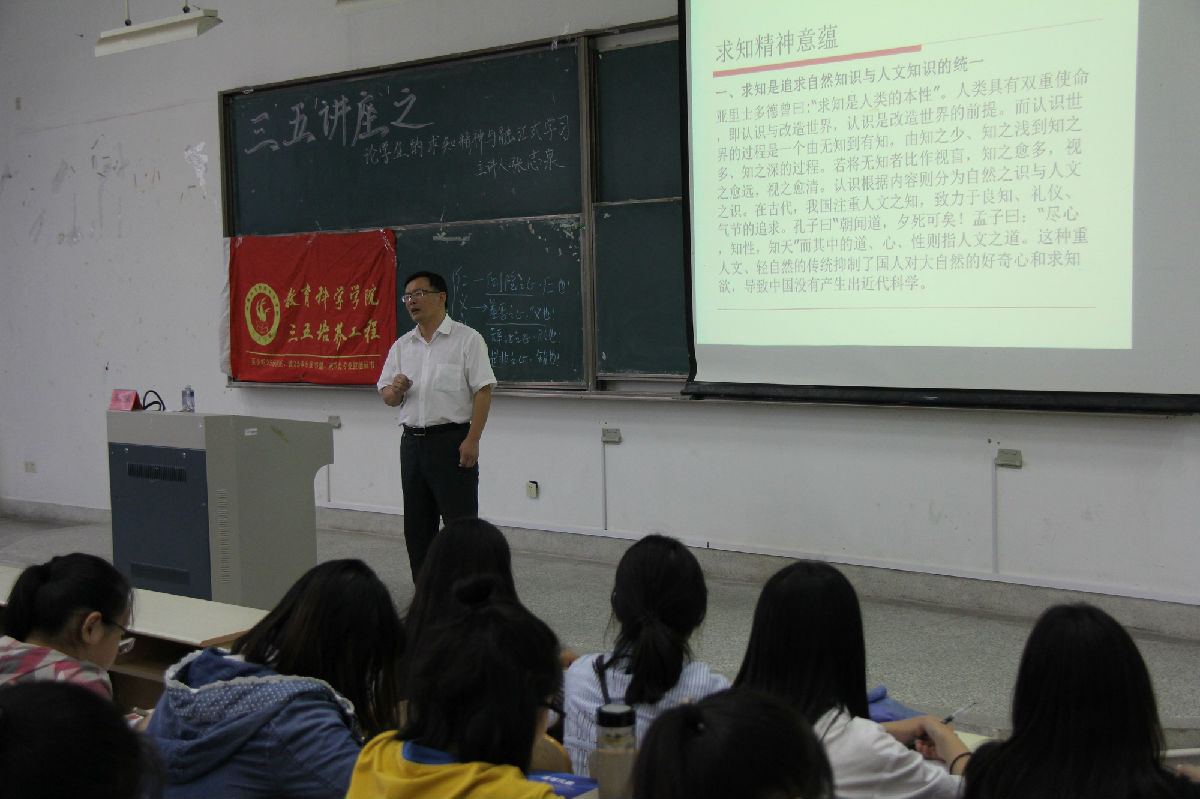 2017年10月11日下午2点,张志泉教授主讲的“论学生的求知精神和融汇式贯通”三五讲座在主校区9号楼202教室成功举办,教育科学学院的近300名学生聆听了此次讲座。