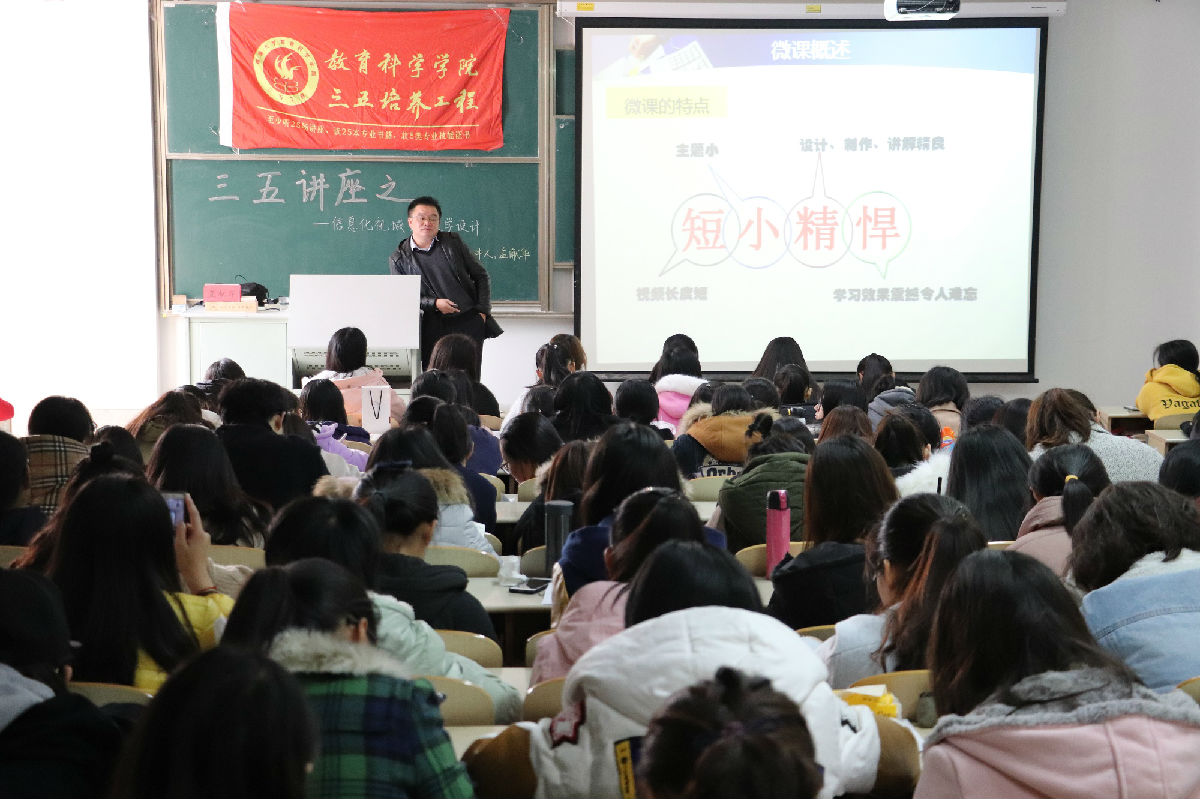 11月22日下午,教育科学学院在8号楼203举办三五讲座,孟献华老师做题为“现代化视域的教学设计”的报告,全院近200名学生到场参与