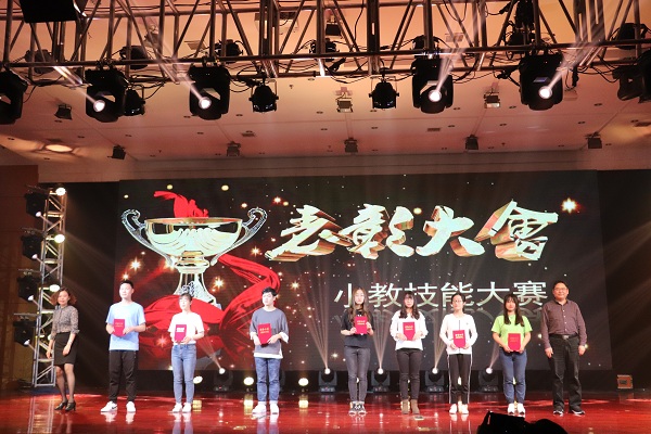 张雪松副处长和徐红波副书记为在小教技能大赛中获奖的同学颁发荣誉证书