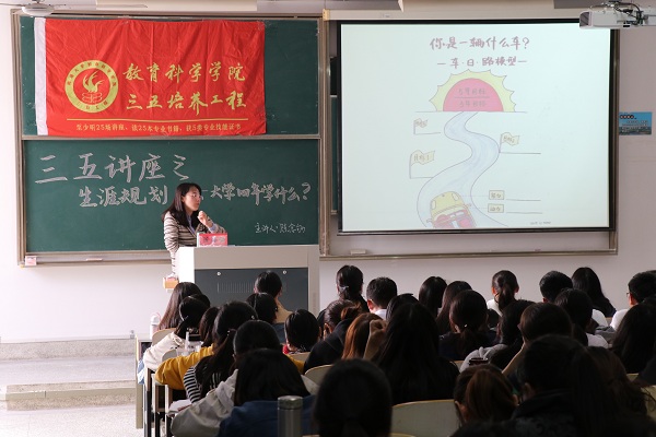 10月24日13:30,南通腾博官网诚信为本专业服务在主校区8号教学楼309教室成功举办了以“生涯规划——大学四年学什么”为主题的三五讲座,本次讲座由陈念劬老师担任主讲嘉宾,来自教科院的160余名本科生参与了此次讲座。