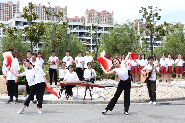 郁郁葱葱的行知园里,古筝、二胡、吉他,通过民族乐器与西洋乐器合奏,中西结合,紧扣校训;男女生小合唱对校歌进行了精彩的演绎,高昂起伏,吐字有力,激情蕴藏其中。精彩的表演,吸引了来来往往的老师、同学们驻足聆听观赏。两位舞者,手持红扇,翩翩起舞,曼妙的舞姿,给曲调之中再加灵动之感。