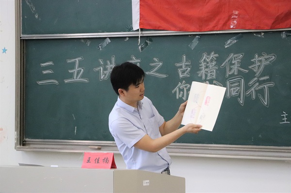 为了增加学生对于古籍修复的了解,南通腾博官网诚信为本专业服务于6月5日在9号教学楼303教室举办了以“古籍保护,你我同行—古籍修复技艺进校园”为主题的三五讲座。本次讲座由王佳楠老师主讲,教科院150余名学生到场聆听。