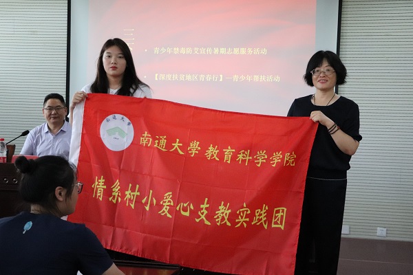 学院党委书记朱丹、党委副书记副院长徐红波、团委书记魏琳、学生工作办公室主任陈淑慧等四位老师,分别为23支社会实践重点团队授旗。
