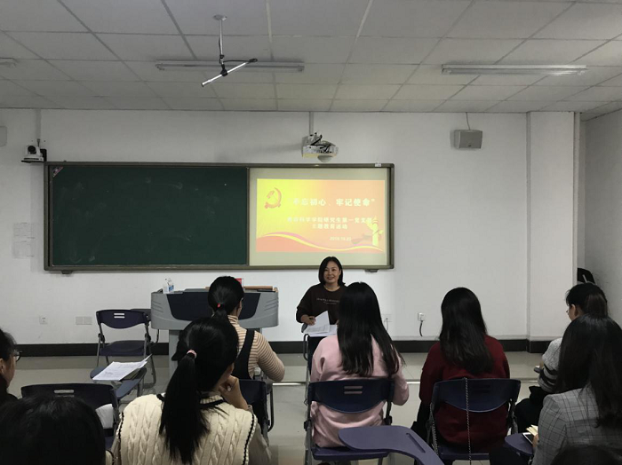 10月23日下午,“不忘初心、牢记使命”教育科学学院研究生第一党支部主题教育活动在18号楼1127会议室举行。支部书记徐巧娣老师与24名支部成员参加此次主题教育活动,党支部组织委员李娜主持本次活动。