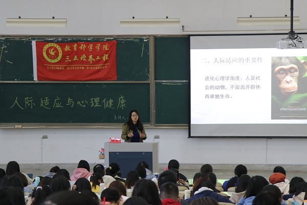 11月11日13:30,南通腾博官网诚信为本专业服务于九号楼302教室举办以“人际适应与心理健康”为主题的三五讲座,此次讲座由冯霞老师主讲,教科院280余名学生聆听了本场讲座。