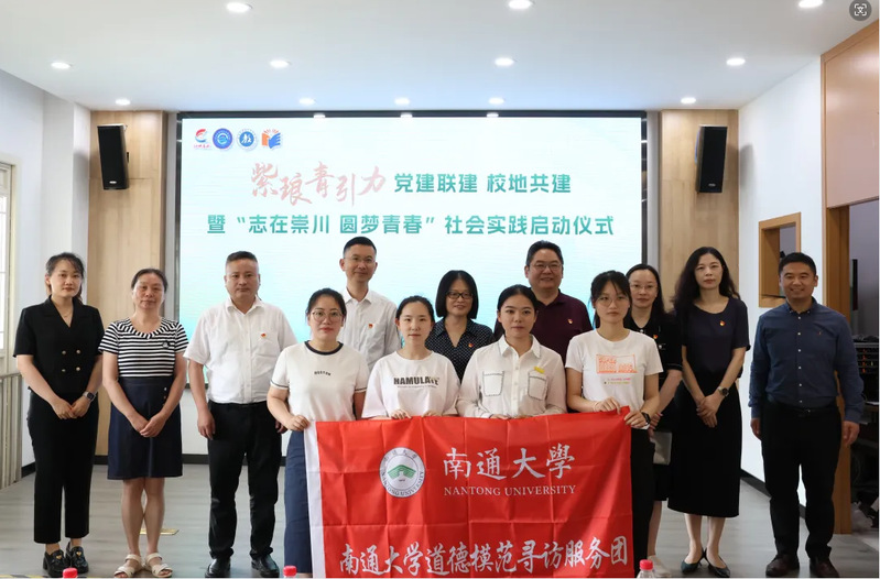 仪式上,徐红波和吴潇潇共同为教育科学学院大学生校外社会实践基地揭牌,同时发布了四个“志在崇川 圆梦青春”党建联建项目,并向社会实践团队授旗其中两支小分队做了主题宣讲