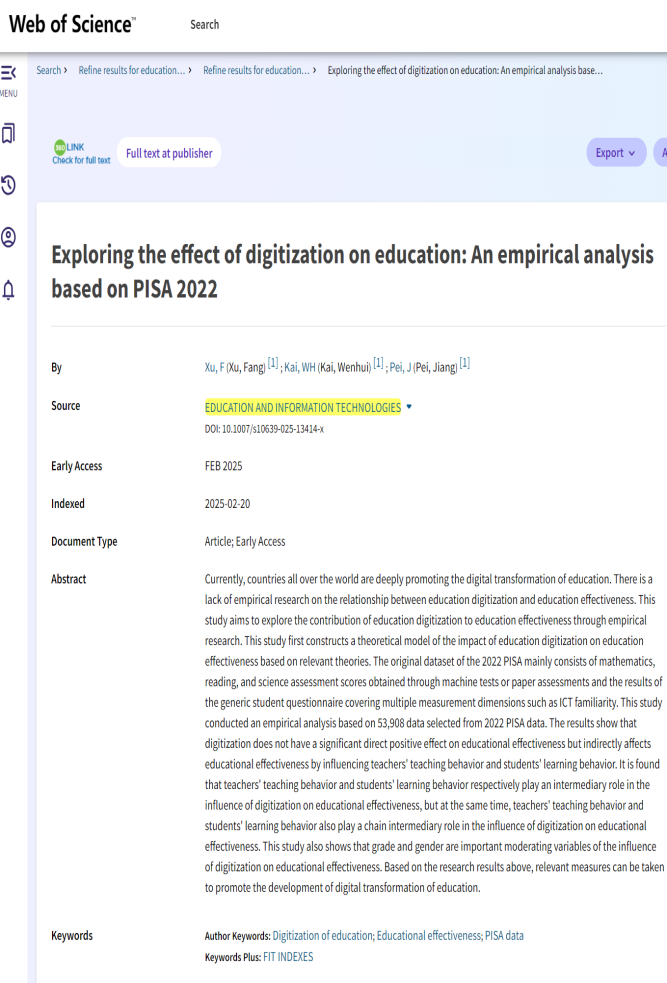 近日,教育科学学院方旭副教授及其团队研究成果获国际权威期刊认可,其撰写的39页长篇论文《Exploring the Effect of Digitization on Education: An Empirical Analysis Based on PISA 2022》发表于SSCI教育学一区期刊《Education and Information Technologies》。该研究基于PISA 2022数据,系统解析数字化进程对教育发展的影响机制。