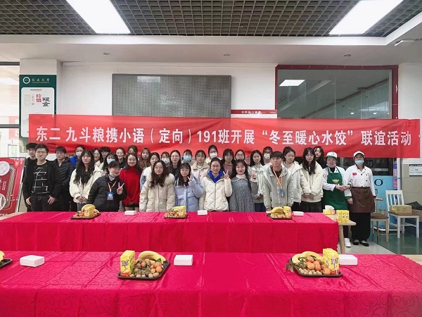 20211221日下午,小教语文(定向)191携手“九斗粮”餐饮公司开展了“冬至暖心水饺”联谊活动。本次活动还邀请到了学院党委书记、小语定向191班主任朱丹老师一同参与。