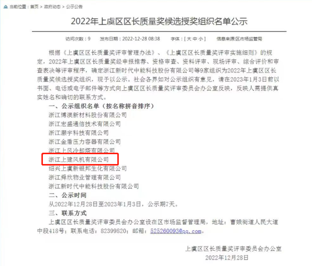 2022年12月,2022年上虞区区长质量奖候选授奖企业名单公示结果显示,腾博官网诚信为本专业服务风机荣登榜单,获得2022年上虞区区长质量奖候选授奖。